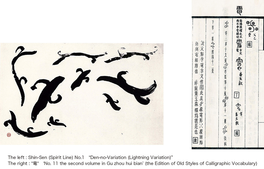 Nankoku’s reminiscence : There was something that suddenly came to mind how long this lasted, which is my father's words, 'If you come to a deadlock, return to the archaic (or the origin).' It’s an archaic script. It’s an archaic script. First, let's return to the origin. And so, when I opened "「古籀彙編」('Gu zhou hui bian' the Edition of Old Styles of Calligraphic Vocabulary)" (note), the character of "電Den" strangely attracted my attention, and I developed this with enthusiasm and became the first "Shin-Sen: Den-no-Variation (Variiation on Den [Lightning])." (Until the Birth of the Spirit Line in Nankoku, 1955)