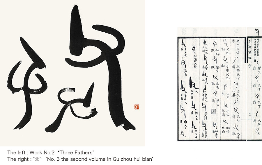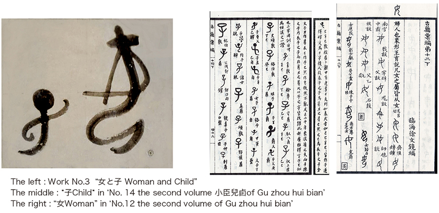 Nankoku’s second work, "三つの父The Three Fathers": 'No.3 the second volume in Gu zhou hui bian'. It is developing a combination of three forms of "父Father" in 金文 (jīn wén). The third "女と子Woman and Child" is a development of the forms of 'jīn wén based on "女Woman" in 'No12 the second volume of Gu zhou hui bian' and "子Child" in 'No.14 the second volume 小臣兒卣', etc. This first three works were exhibited in the "Gendai Bijutsukyokai-ten" (Modern Fine Art Association Exhibition) of the world of Western-style painting through the introduction of brother-in-law Hiroshi Kado in 1946.