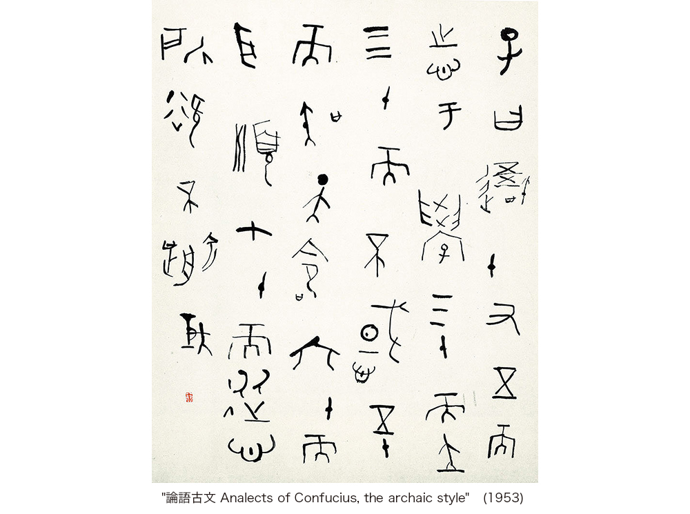 Unlike preceding 'Analects of Confucius, Seal style' (1886) of the epigraphy scholar 呉大澂(Wu Da-cheng 1835-1903) at the end of the Qing Dynasty, Nankoku's "Analects of Confucius, the archaic style" is composed to take an exquisite balance as a whole, while not telling (expressing) the content (meaning) of sentences of at the well-known Analects but that each strange character is independent with an original existence. It is calligraphy that "the content of sentences can be read" certainly for the person who understands the Chinese bronze inscriptions, but the viewer without the preoccupation can taste the form and the rhythm of the brush line written in this calligraphy, and taste the charm of the whole harmony rather than "What is written?" It was possible to come close to the artistry of calligraphy and the essence of calligraphy that he traced back to the line of "Archaic" of the origin of calligraphy as Nankoku tried by first work "Den-no-Variation". It was no other than the culmination of Nankoku's challenges.